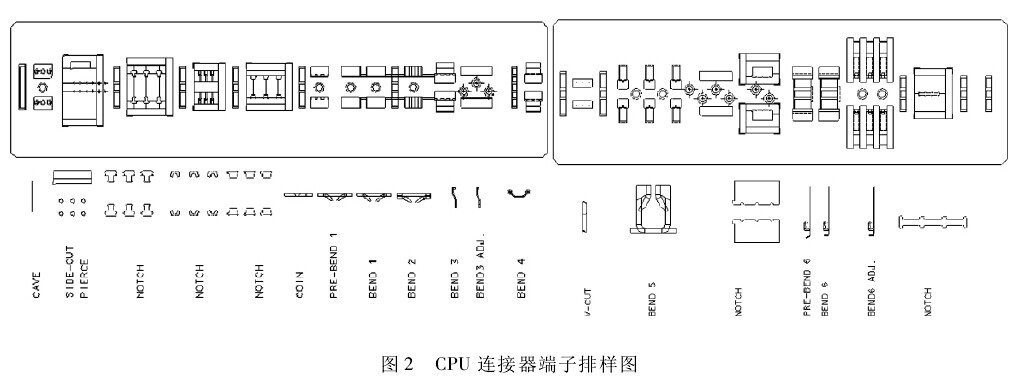 根據(jù)后續(xù)電鍍及裝配的需要,端子沖壓產(chǎn)品設計時己經(jīng)規(guī)定了送料步距、載體形式以及導正定位針的大小、位置等。工位設計時考慮此端子部分關鍵區(qū)域(如“R”形頭部)不允許有沖裁毛刺,設置有倒角去毛刺工站(COIN )。根據(jù)前述分析,CPU連接器端子沖壓排樣圖如圖2所示。